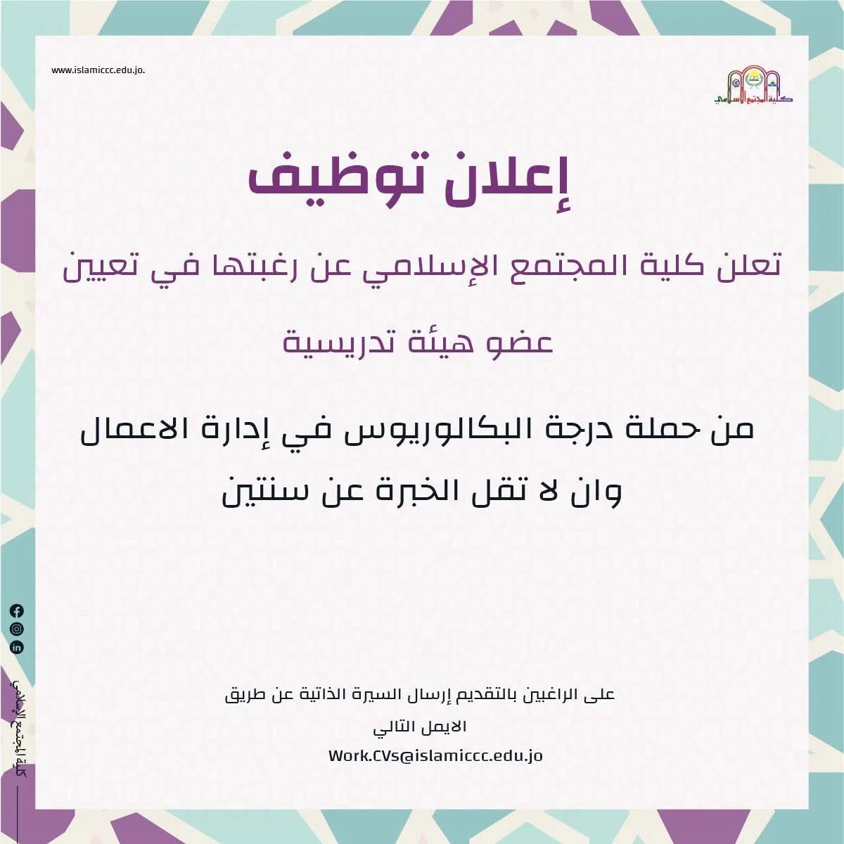تعلن كلية المجتمع الإسلامي عن رغبتها في تعيين عضو هيئة تدريسية من حملة درجة البكالوريوس في إدارة الأعمال، على أن تتوفر فيه الشروط التالية: