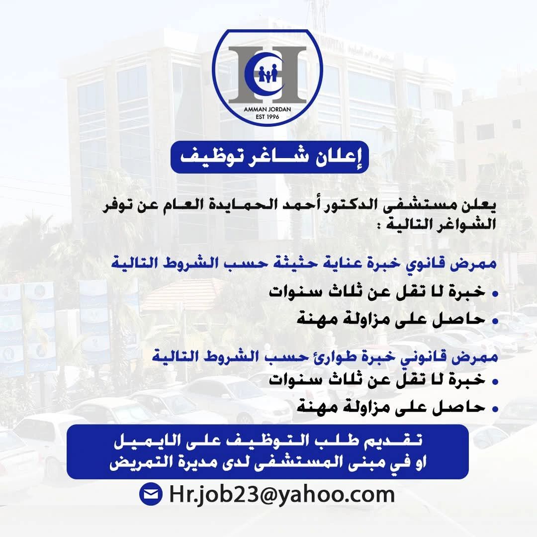 يعلن مستشفى الدكتور أحمد الحمايدة العام في العاصمة عمّان عن توفر شواغر تمريضية في التخصصات التالية: