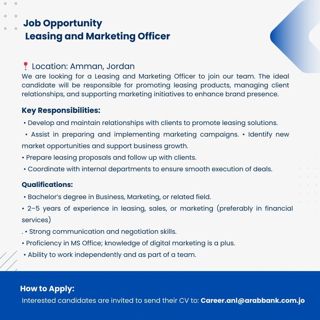 يعلن البنك العربي عن توفر شاغر وظيفي بمسمى Leasing and Marketing Officer للانضمام إلى فريقه في عمان – الأردن.