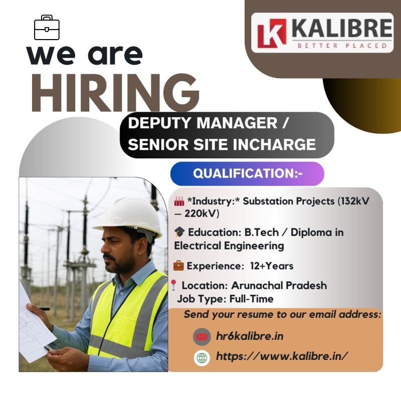 تُعلن شركة KALIBRE عن توفر شواغر وظيفية لمشاريع محطات الكهرباء بقدرات (132kV – 220kV) في ولاية Arunachal Pradesh بالهند.