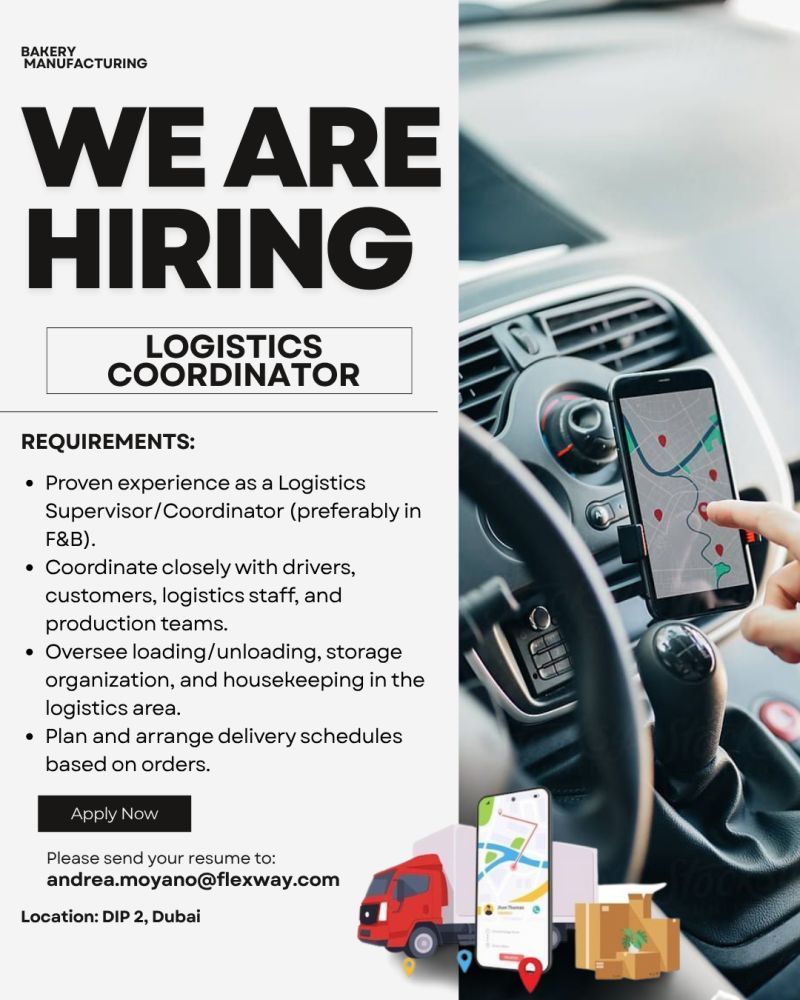تعلن شركة مختصة في صناعة المخبوزات عن حاجتها لتعيين منسق لوجستي (Logistics Coordinator) ذو خبرة سابقة في الإشراف أو التنسيق اللوجستي، ويفضل في مجال الأغذية والمشروبات (F&B).