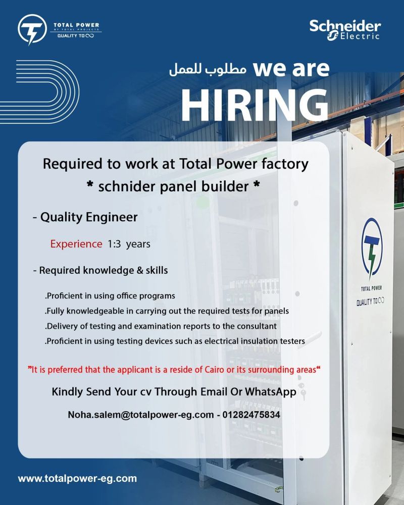 مطلوب مهندس جودة للعمل في مصنع Total Power المعتمد من Schneider Electric – في القاهرة