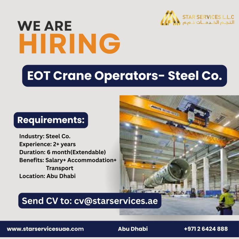 نعلن في شركة ستار سيرفيس L.L.C عن توفر وظائف مشغل رافعة EOT للعمل في صناعة الصلب في أبوظبي لعام 2025.