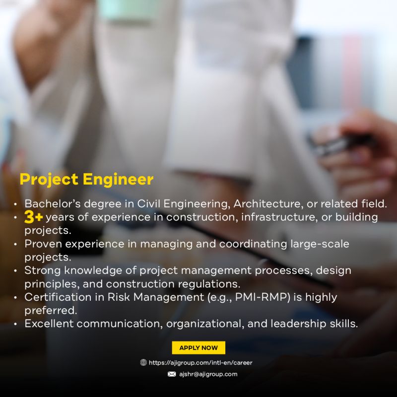 تُعلن شركة AJ عن توفر شاغر وظيفي بمسمى مهندس مشاريع (Project Engineer) ضمن مشاريعها في البنية التحتية والإنشاءات. إذا كنت تبحث عن وظائف هندسية في السعودية 2025، فهذه الفرصة قد تناسبك.