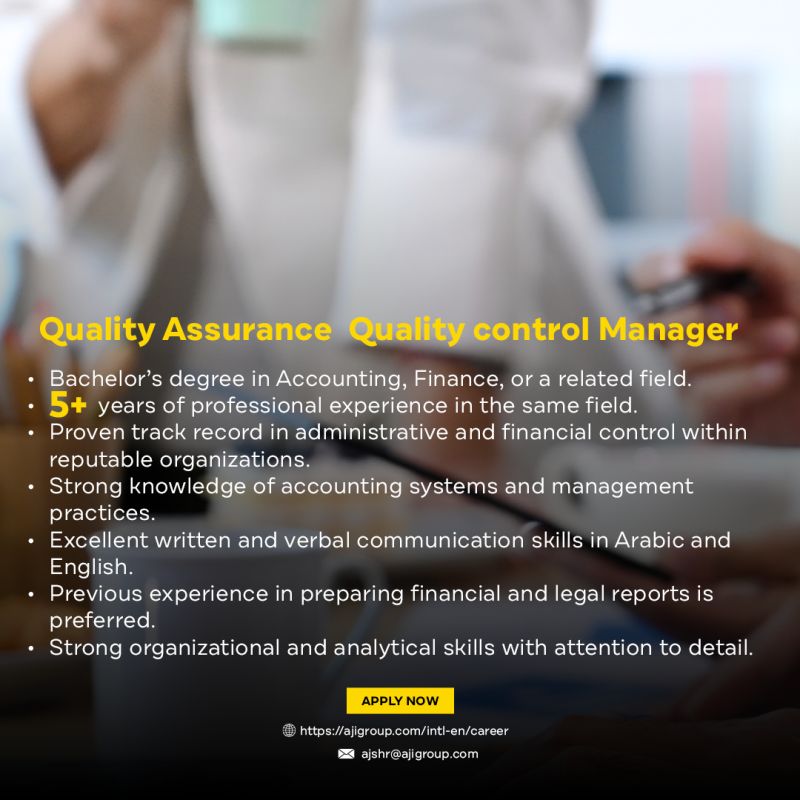 تعلن شركة AJ عن فتح باب التوظيف لشغل وظيفة مدير ضمان وجودة رقابية (Quality Assurance / Quality Control Manager) للعمل ضمن فريق الإدارة المالية. الفرصة موجهة لأصحاب الخبرات في المحاسبة والرقابة المالية في منظمات مرموقة، الباحثين عن وظائف في السعودية 2025.
