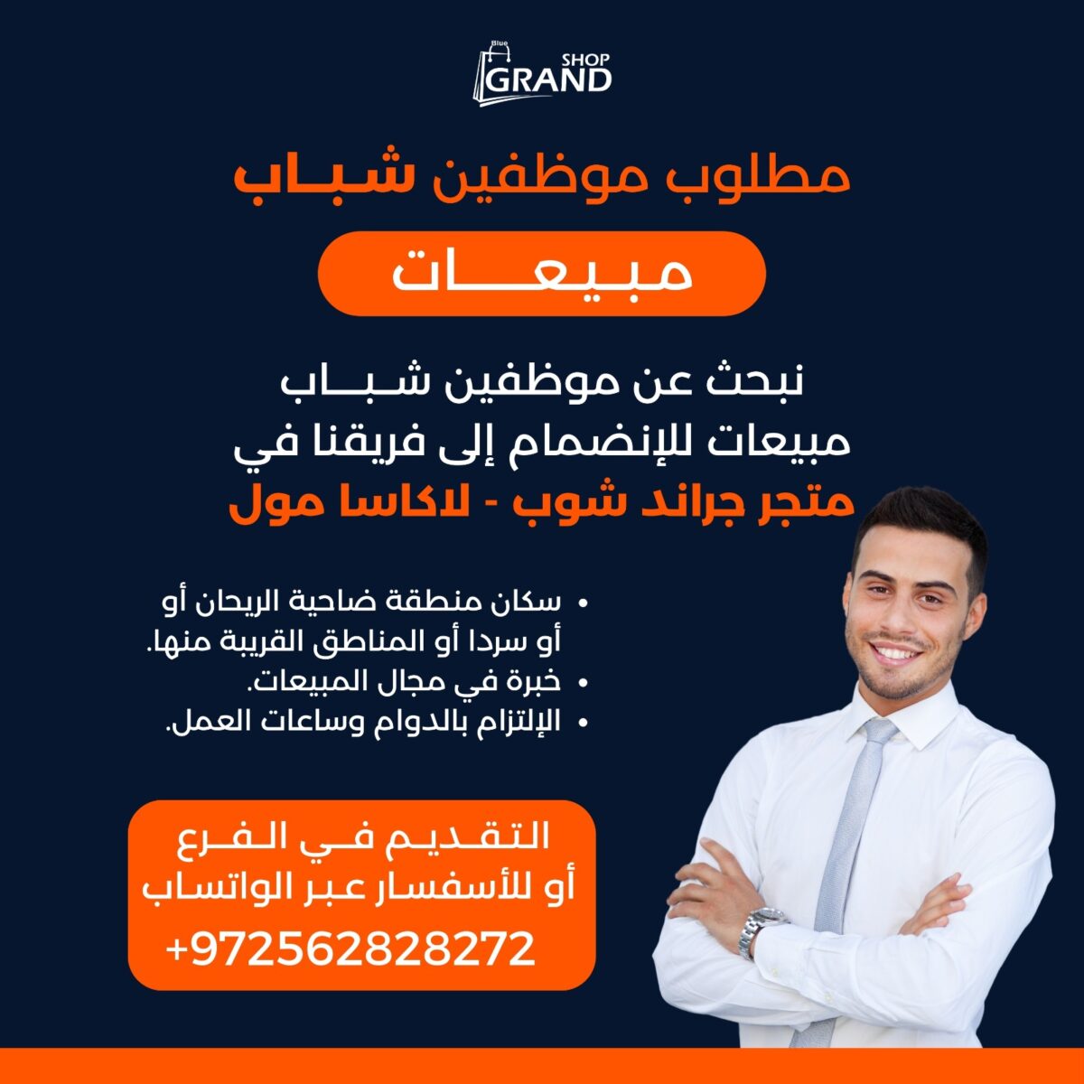 يعلن متجر Grand Shop – لاكاسا مول عن حاجته لتعيين موظفين وموظفات مبيعات للانضمام إلى فريق العمل وفق التفاصيل التالية: