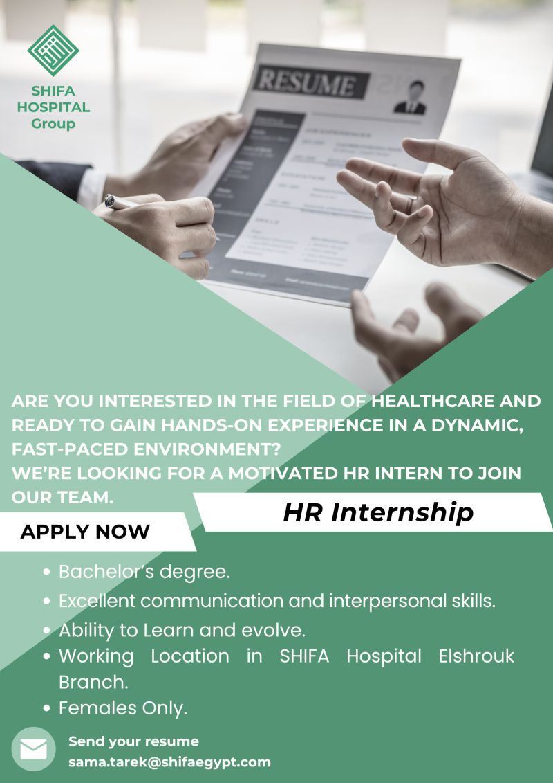 🟢 مستشفى الشفاء يعلن عن توفر فرصة تدريب في قسم الموارد البشرية (HR Internship) في فرع الشروق – القاهرة.