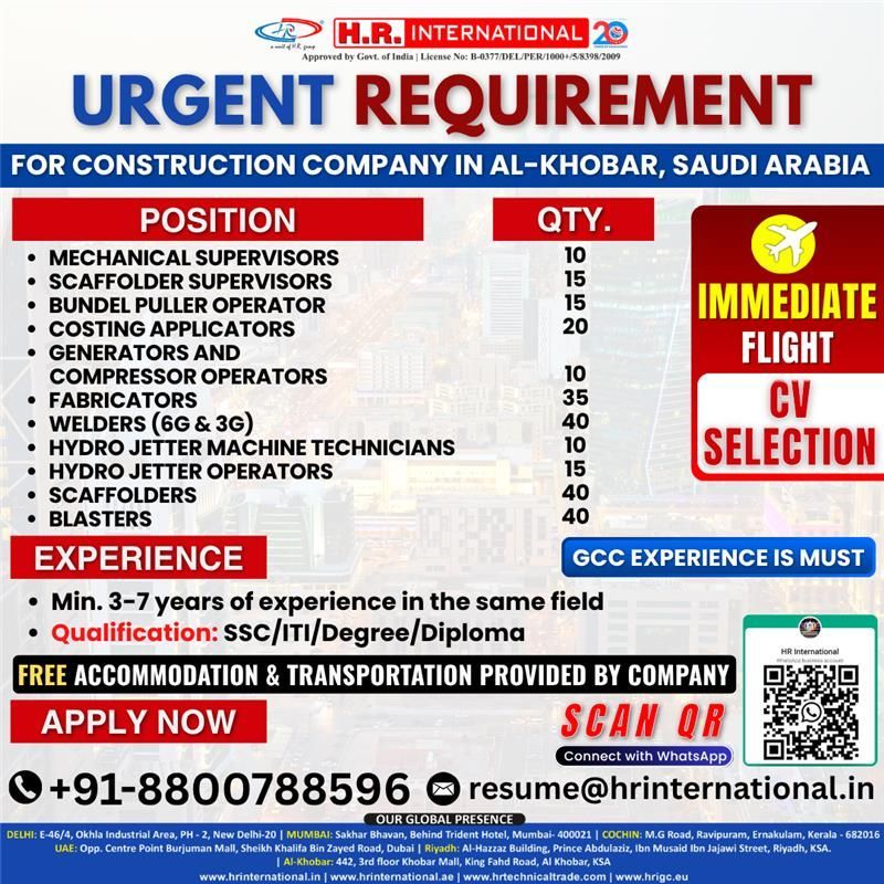 تُعلن شركة إنشاءات كبرى في مدينة الخبر – المملكة العربية السعودية عن حاجتها لعدد من الكفاءات في التخصصات التالية للعمل فورًا، مع رحلة فورية واختيار مباشر من السيرة الذاتية (CV Selection).