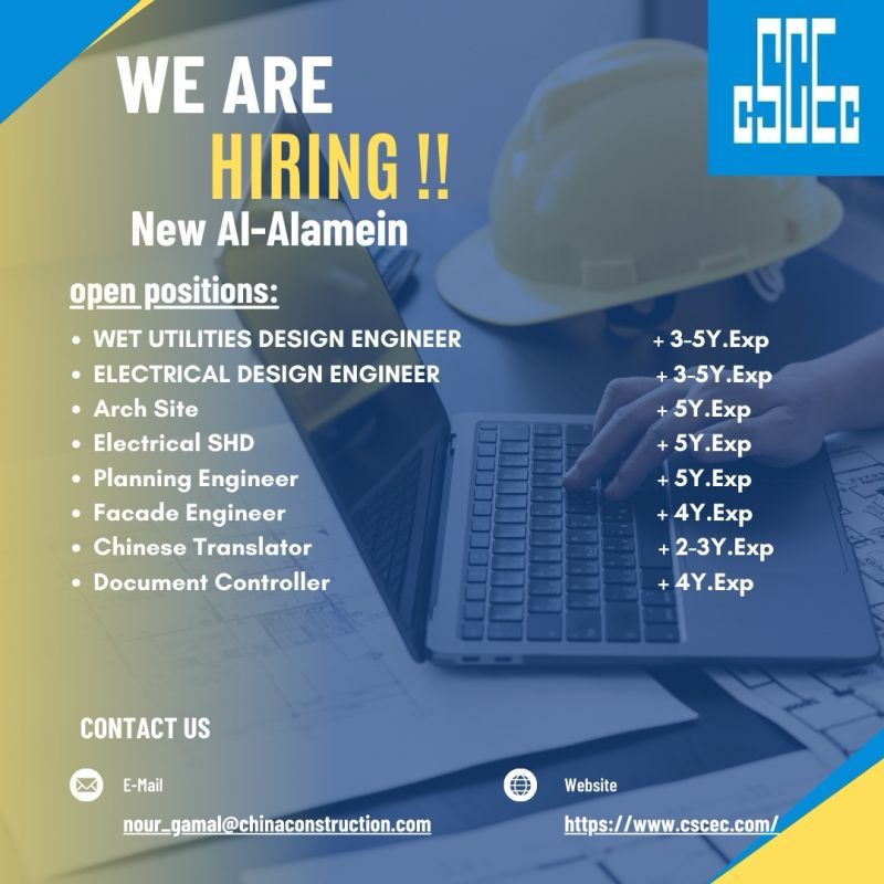 تُعلن شركة CSCEC – China State Construction عن توفر عدد من الوظائف الفنية والهندسية والإدارية في مدينة العلمين الجديدة، مع فرص حقيقية للتطور المهني والعمل ضمن فريق دولي.