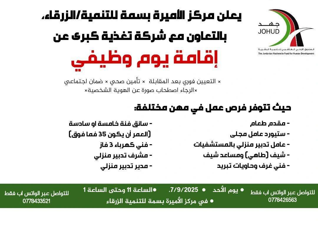 هل تبحث عن فرصة عمل جديدة؟ تعلن مركز الأميرة بسمة للتنمية الزرقاء بالتعاون مع شركة تغذية كبرى عن يوم توظيف، حيث سيتم عرض فرص عمل متعددة في عدة تخصصات.