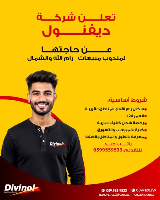 تعلن شركة ديفينول فلسطين عن حاجتها لتعيين مندوب مبيعات للانضمام إلى فريق العمل في منطقة رام الله والبيرة.
