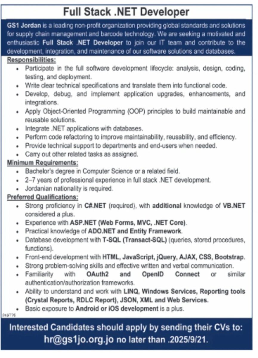 وظائف Full Stack .NET Developer لدى GS1 Jordan – عمّان 2025