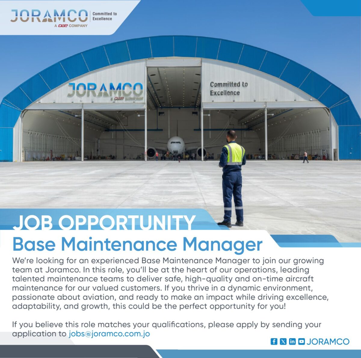 تعلن شركة JORAMCO الرائدة في صيانة الطائرات ومقرها في عمّان – الأردن عن حاجتها لتعيين Base Maintenance Manager محترف للانضمام إلى فريقها المتنامي لعام 2025.