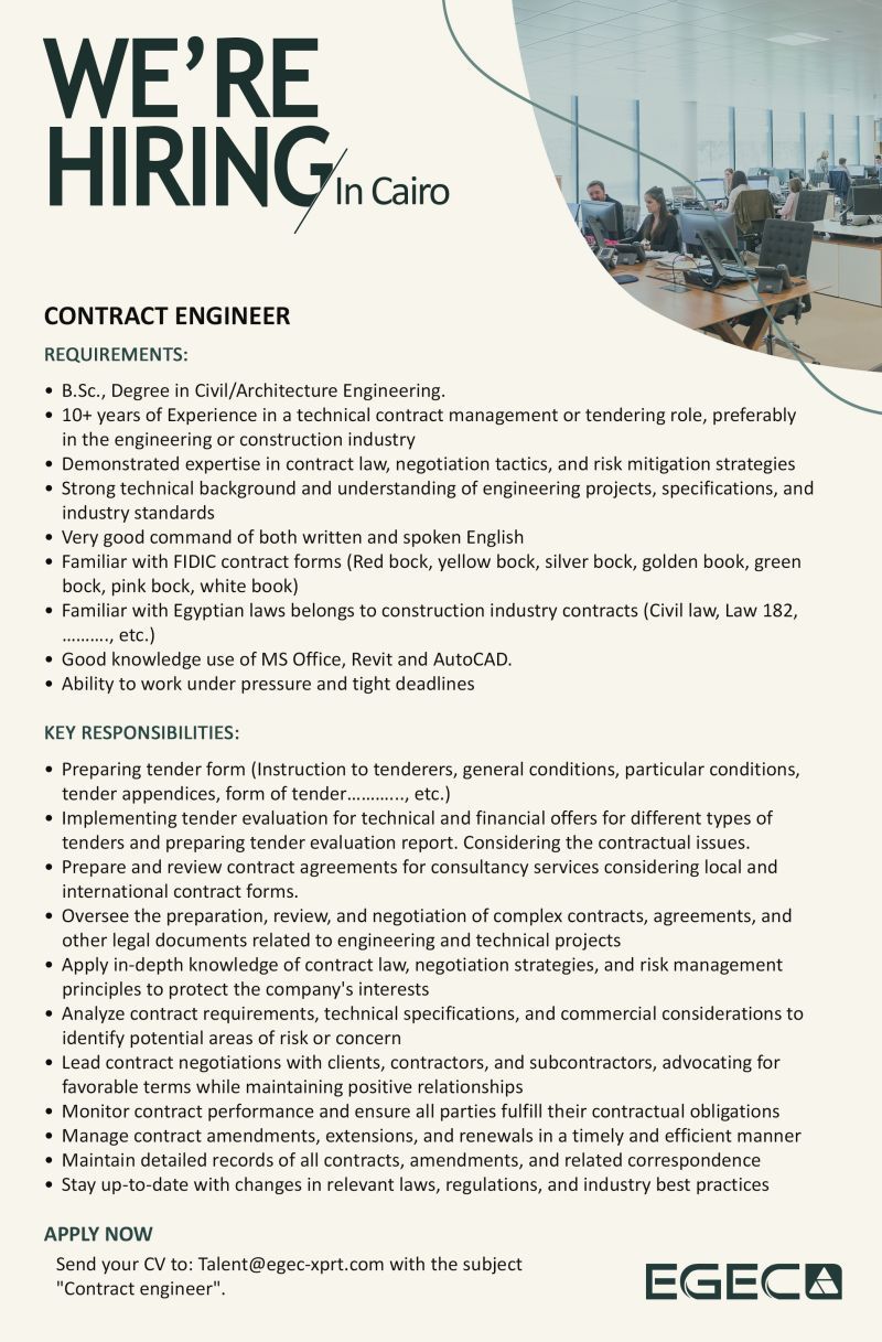 تعلن شركة EGECA عن حاجتها لتعيين Contract Engineer للعمل ضمن فريقها في القاهرة – مصر لعام 2025. إذا كنت تمتلك خبرة في إدارة العقود والمناقصات في المجال الهندسي أو الإنشائي، فهذه فرصة مثالية للانضمام إلى فريق احترافي.