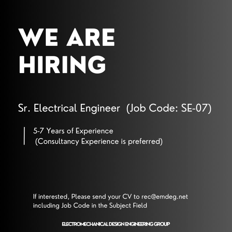 تعلن شركة Electromechanical Design Engineering Group (EMDEG) عن حاجتها لتعيين مهندس كهرباء أول (Sr. Electrical Engineer) للعمل في مشاريعها الاستشارية في القاهرة. إذا كنت تمتلك خبرة قوية في المجال وتبحث عن تحدٍ جديد، فهذه الفرصة مناسبة لك.