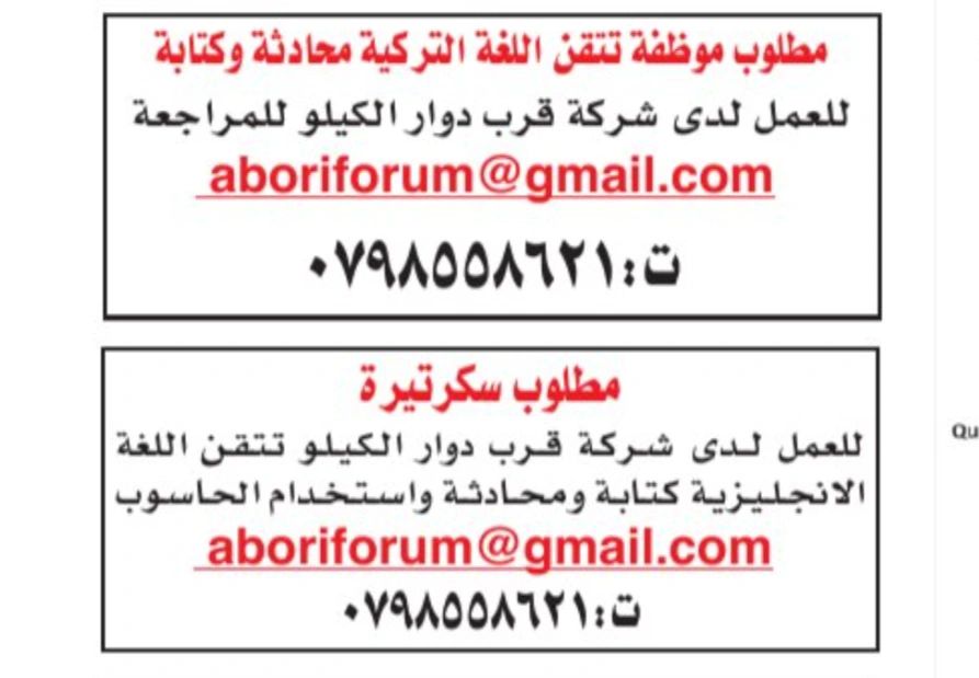 تُعلن شركة خاصة مقرّها قرب دوار الكيلو في عمّان عن حاجتها لتوظيف: