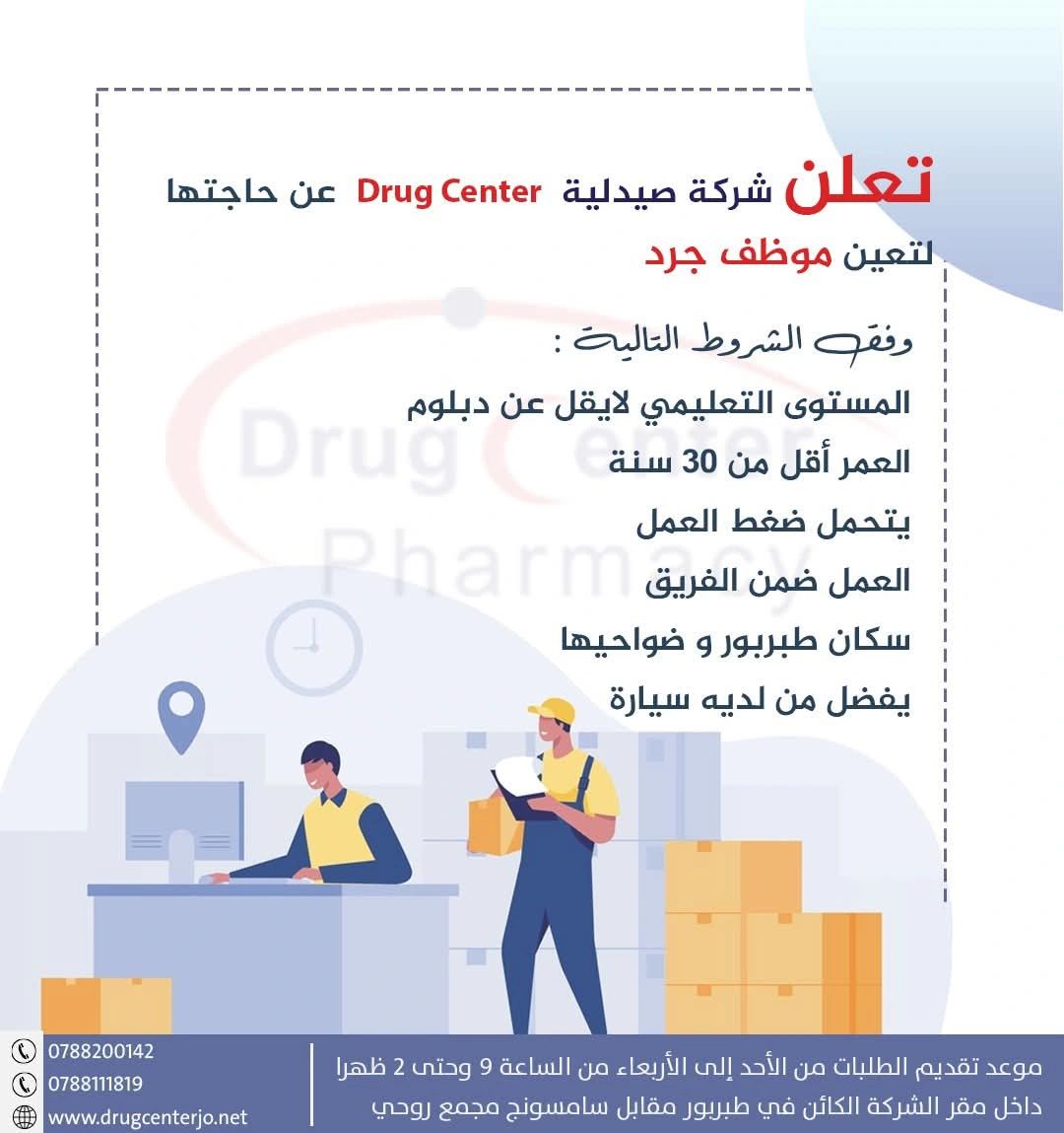 تُعلن صيدلية Drug Center في منطقة طبربور – عمّان عن حاجتها لتعيين موظف جرد ضمن فريقها للعام 2025، وذلك ضمن الشروط التالية: