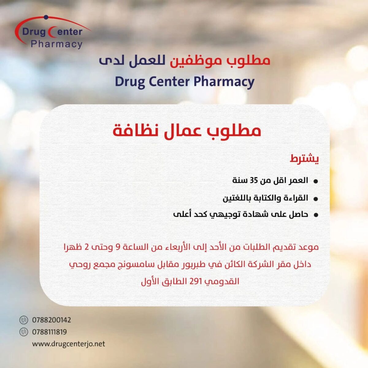 فرصة عمل جديدة لعام 2025 في مدينة عمّان، حيث تعلن صيدلية Drug Center Pharmacy عن حاجتها إلى تعيين عمال نظافة ضمن طاقم العمل، وفقًا للشروط التالية: