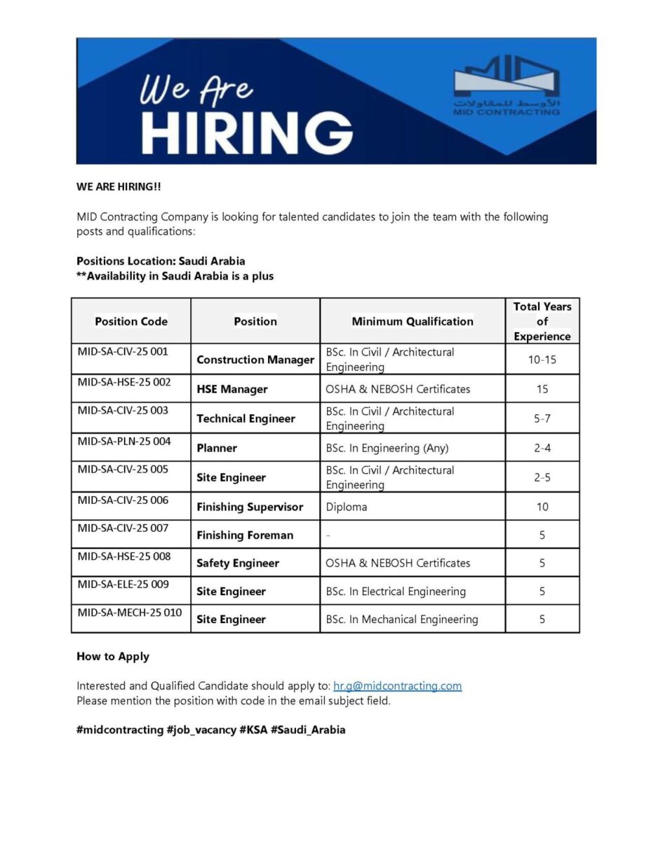 تعلن شركة MID Contracting عن توفر عدد من الوظائف الهندسية والإشرافية في المملكة العربية السعودية للعام 2025، وتشترط توفر المؤهلات والخبرة المناسبة لكل وظيفة. الأفضلية للمقيمين داخل السعودية.
