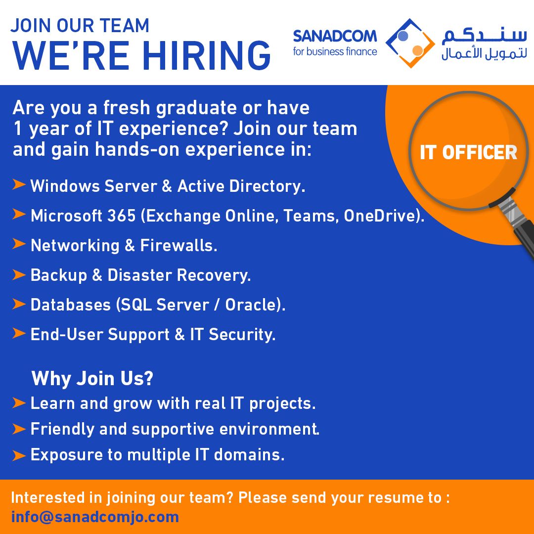 📢 فرص وظيفية مميزة في عمّان – وظائف IT Officer لدى Sanadcom 2025