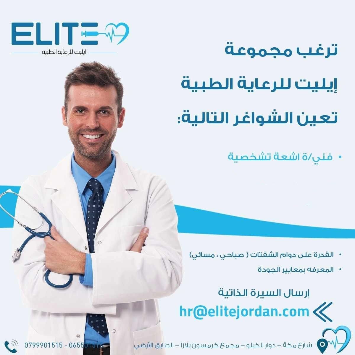 تعلن إيليت للرعاية الطبية عن حاجتها لتوظيف فني/ة أشعة تشخيصية للعمل بالفترة المسائية ضمن مجمع كرمسون بلازا في شارع مكة، دوار الكيلو.