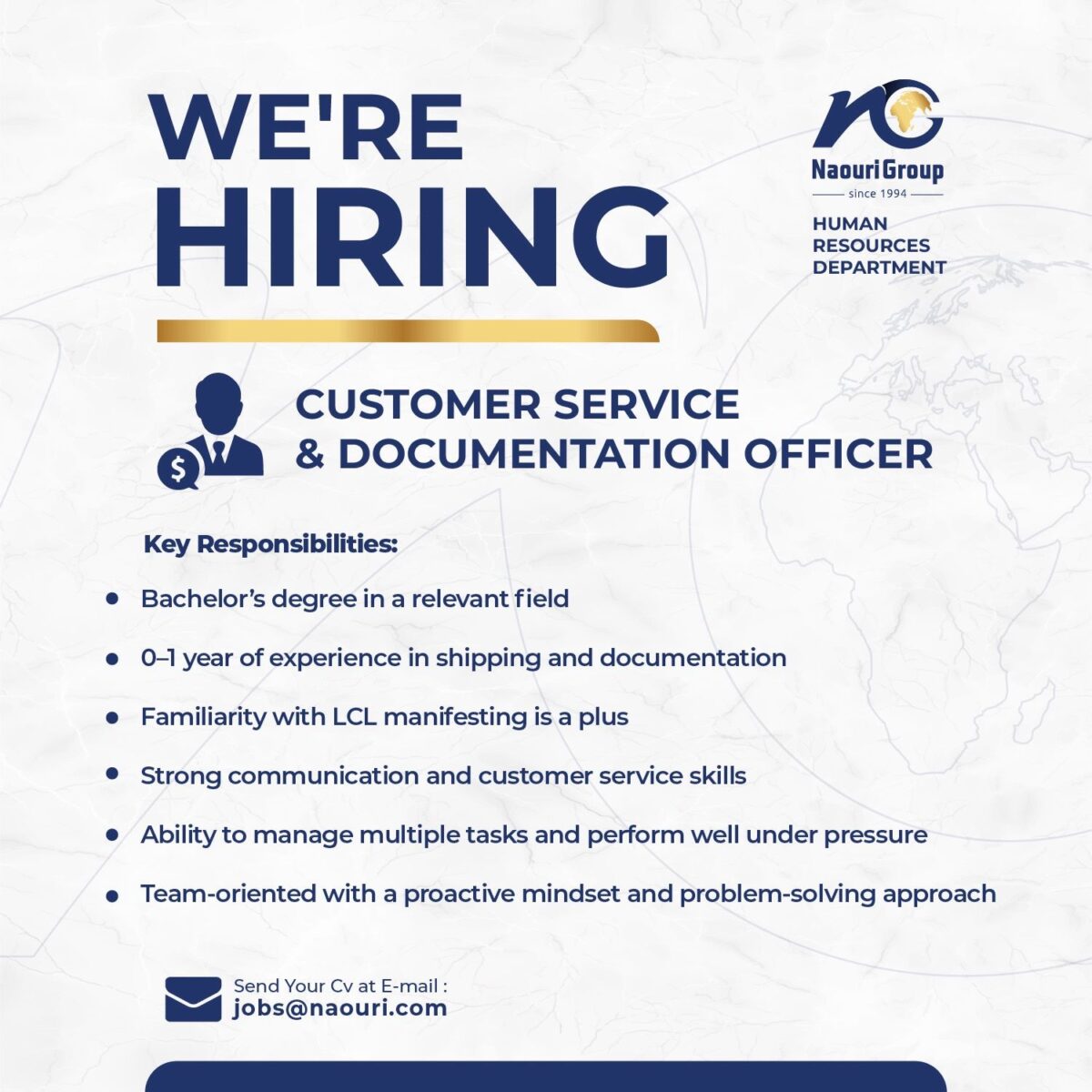 تعلن Naouri Group عن حاجتها لتعيين Customer Service & Documentation Officer للانضمام إلى فريق الموارد البشرية.