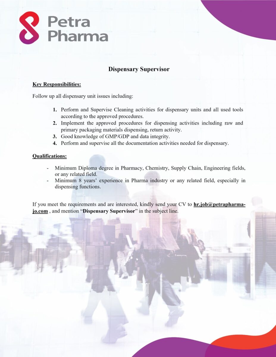 إذا كنت تبحث عن وظائف إشراف في مجال الصيدلة لدى شركة رائدة في عمّان، فإن شركة Petra Pharma تعلن عن حاجتها لتعيين مشرف صيدلية بخبرة قوية في القطاع الدوائي.