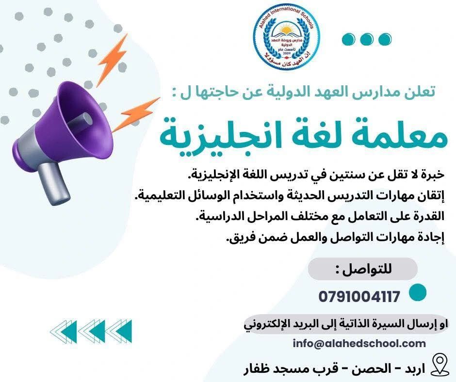 📢 فرصة عمل – معلمة لغة إنجليزية – مدارس العهد الدولية – إربد 2025