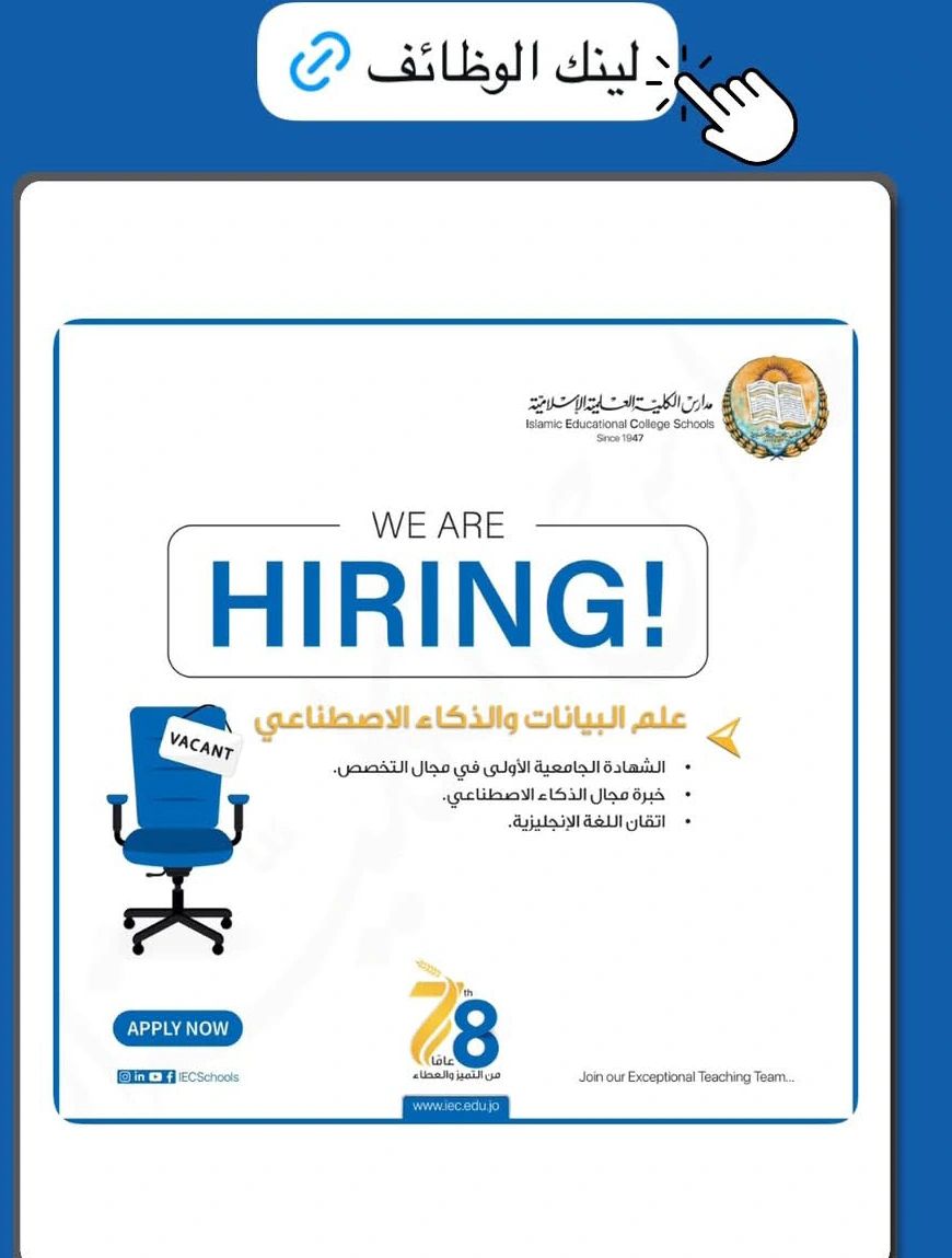 📢 وظائف شاغرة – مدرس علم بيانات وذكاء اصطناعي – مدارس الكلية العلمية الإسلامية – عمّان 2025