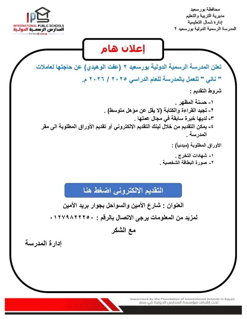 أعلنت المدرسة الرسمية الدولية ببورسعيد 2 (عفت الهويدي) عن حاجتها لتعيين عاملات نظافة للعمل خلال العام الدراسي 2025/2026، وفقًا للشروط التالية: