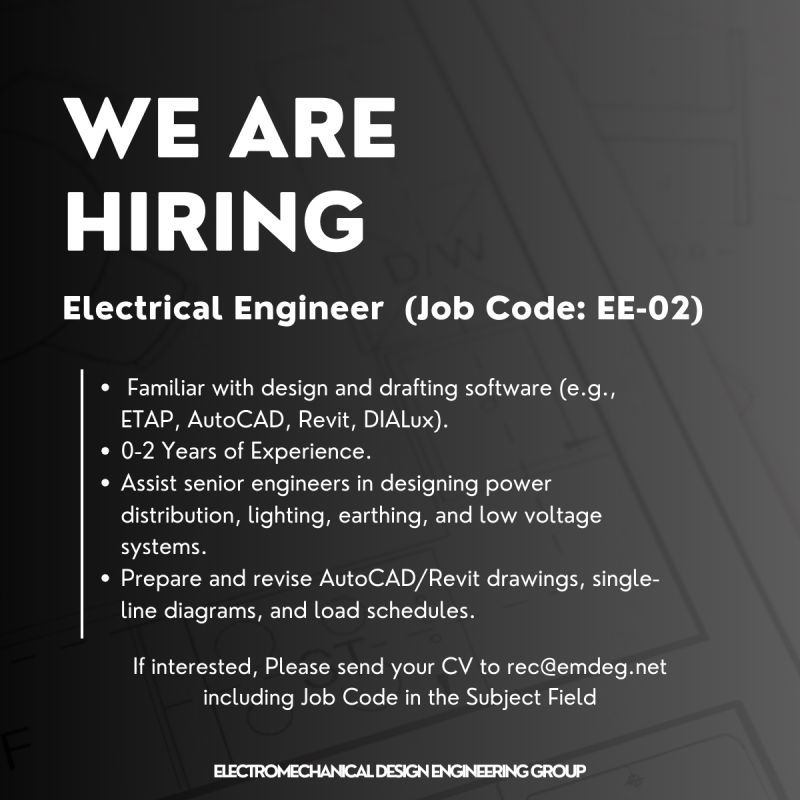 تعلن Electromechanical Design Engineering Group عن حاجتها لتعيين مهندس كهرباء (Job Code: EE-02)، وذلك ضمن فرص وظائف الهندسة الكهربائية للعام 2025.