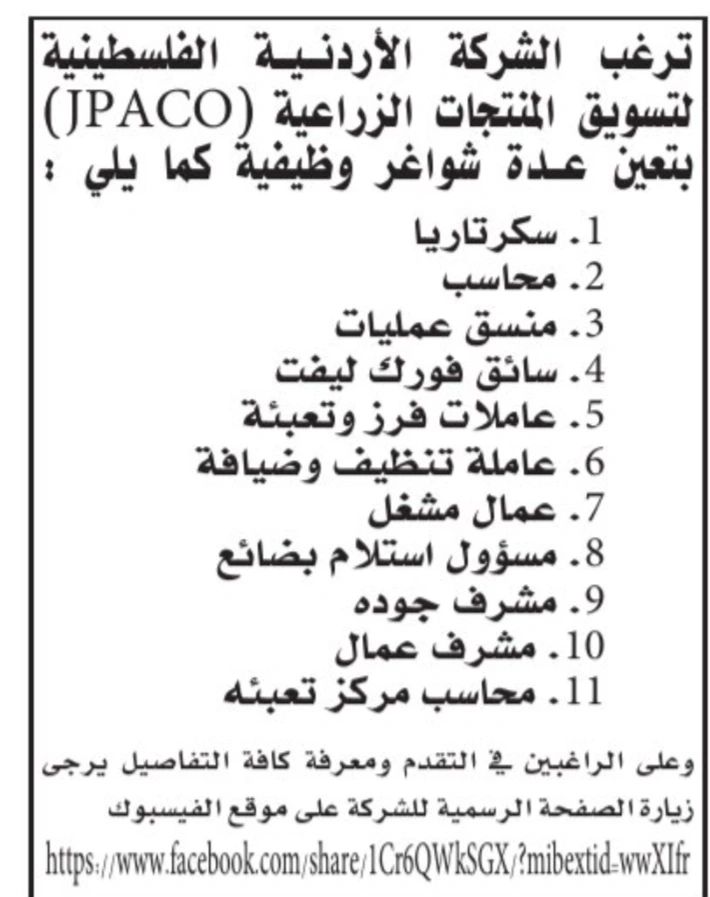 فرص عمل في الأردن 2025 – شركة JPACO الأردنية الفلسطينية لتسويق المنتجات الزراعية تعلن عن توفر مجموعة من الوظائف الإدارية والفنية في عدة تخصصات، وهي:
