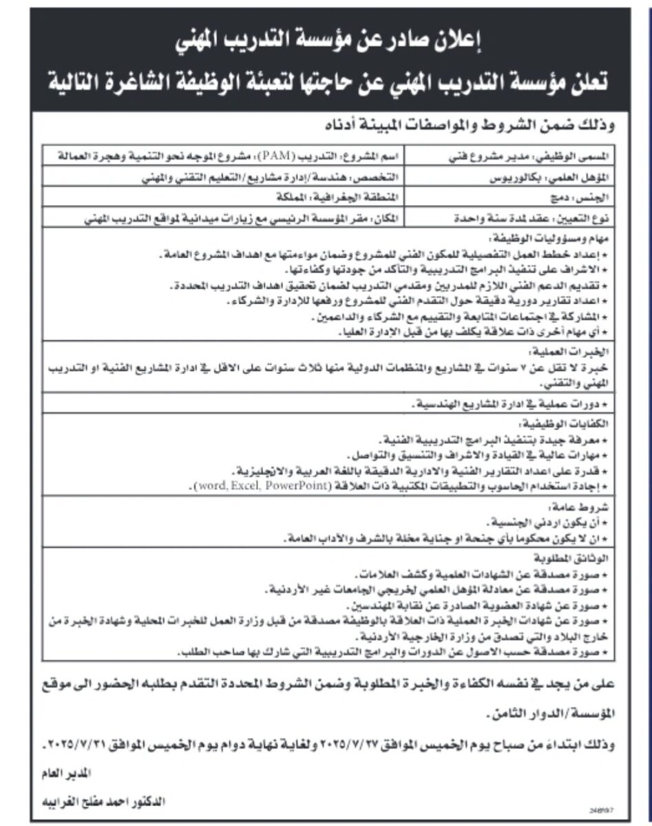 إعلان توظيف صادر عن مؤسسة التدريب المهني في الأردن، تعلن فيه عن حاجتها لتعيين مدير مشروع فني ضمن مشروع التوجه نحو التنمية وتمكين المجتمعات المحلية (PAM)، وذلك ضمن المؤهلات والشروط التالية: