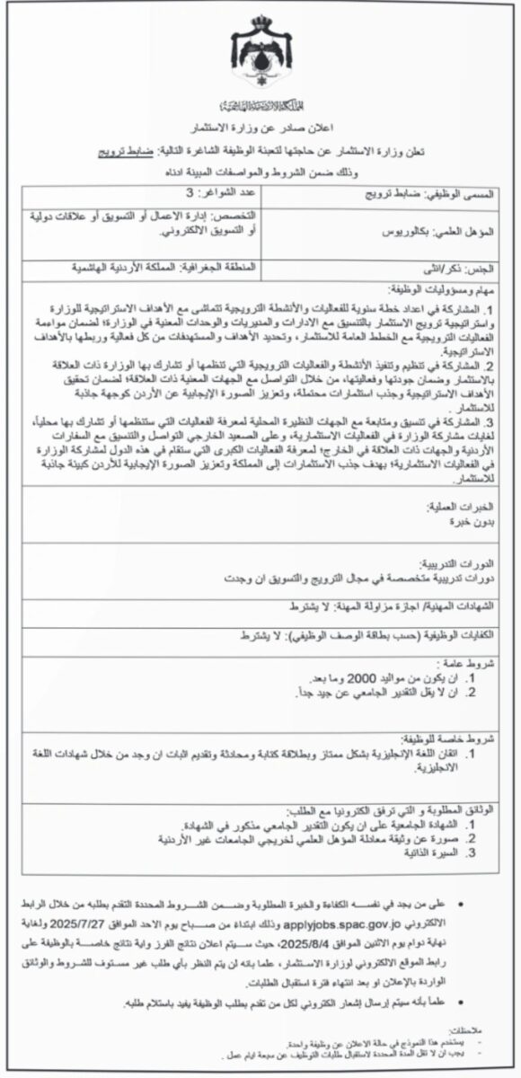 فرص توظيف حكومية في الأردن – تعلن وزارة الاستثمار عن حاجتها لتعبئة 3 شواغر وظيفية بمسمى “ضابط ترويج”، ضمن المؤهلات والمتطلبات التالية:
