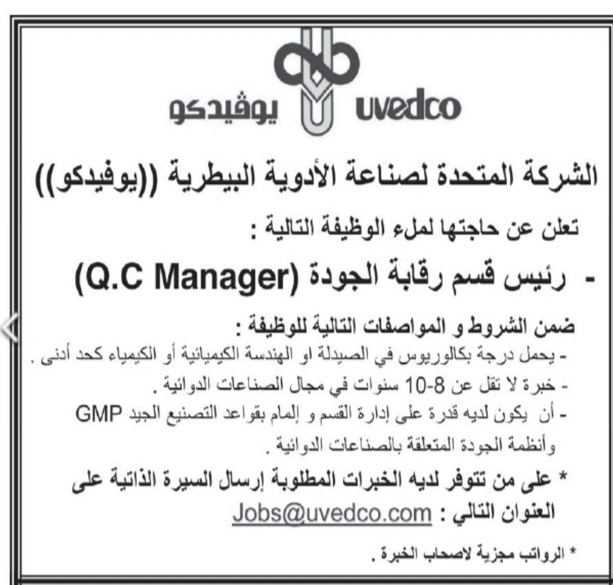 رئيس قسم رقابة الجودة (Q.C Manager)