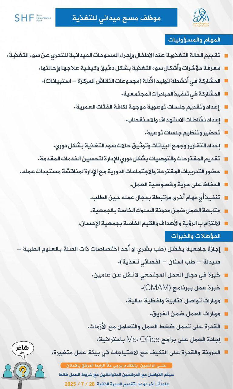 تُعلن جمعية الإحسان الخيرية التنموية عن توفر فرص عمل مميزة ضمن مشروع الاستجابة الطارئة للفئات الأشد ضعفاً، بالتعاون مع صندوق سوريا الإنساني (SHF).