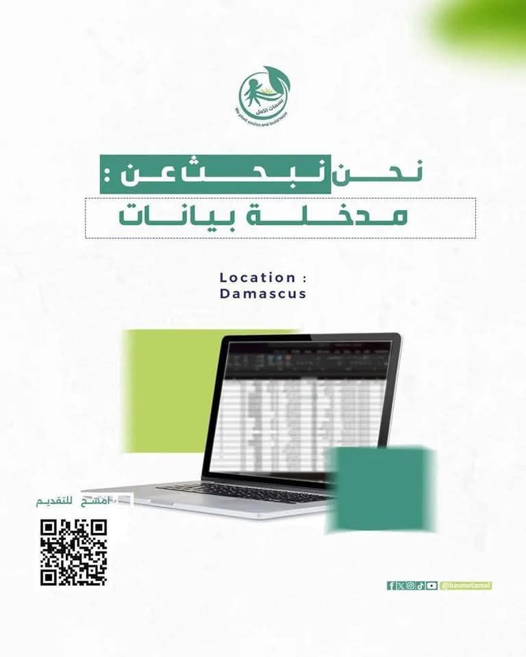 تعلن جمعية بسمات الأمل عن حاجتها إلى مدخل/ة بيانات للعمل ضمن فريقها في مدينة دمشق، وذلك ضمن بيئة إنسانية ومهنية تتيح لك تطوير خبراتك والمساهمة في دعم المجتمع.