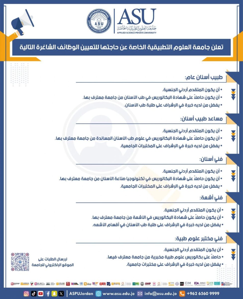 📢 وظائف شاغرة في كلية طب الأسنان – جامعة العلوم التطبيقية الخاصة – عمّان 2025