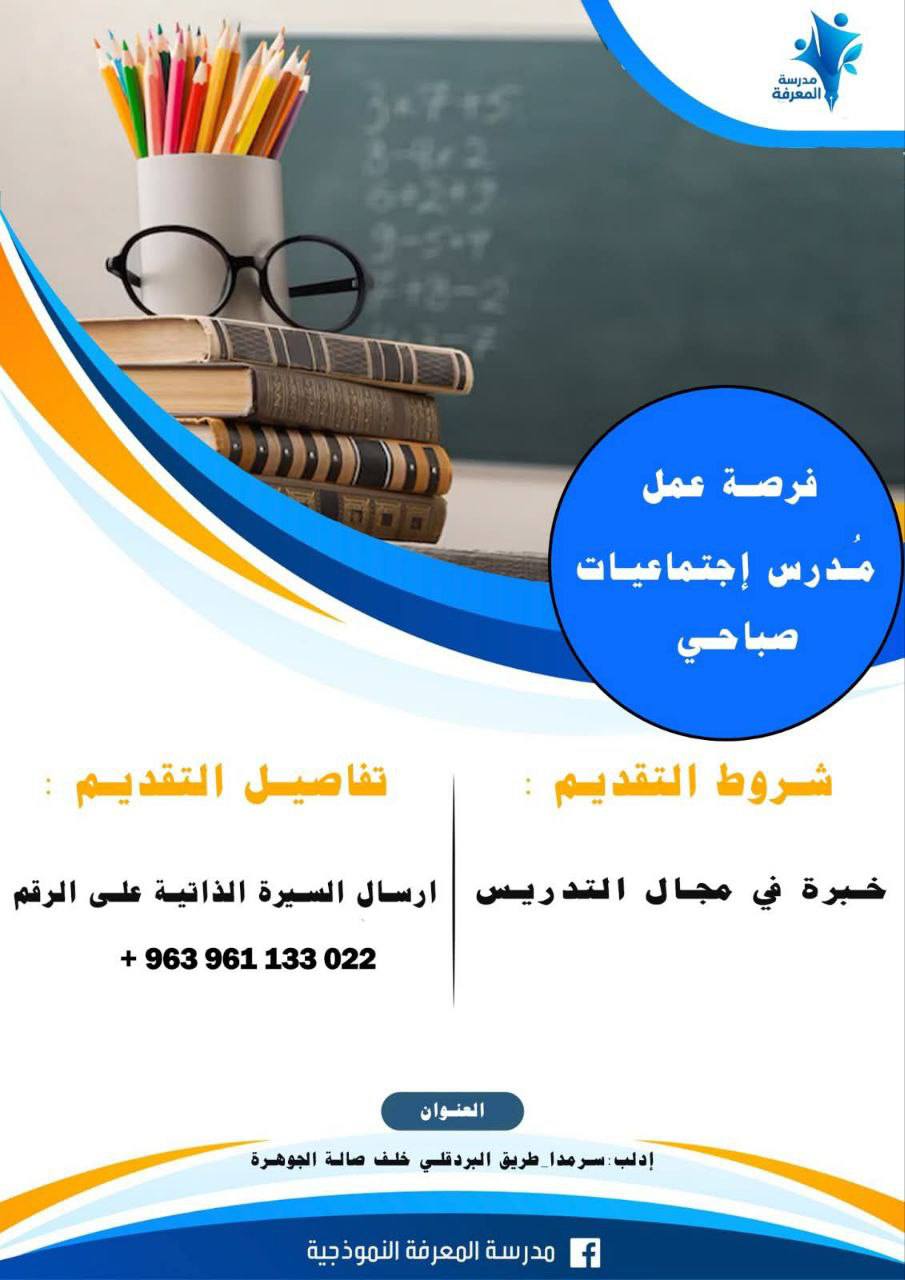 📢 فرصة عمل – مدرس اجتماعيات صباحي | مدرسة المعرفة النموذجية – إدلب