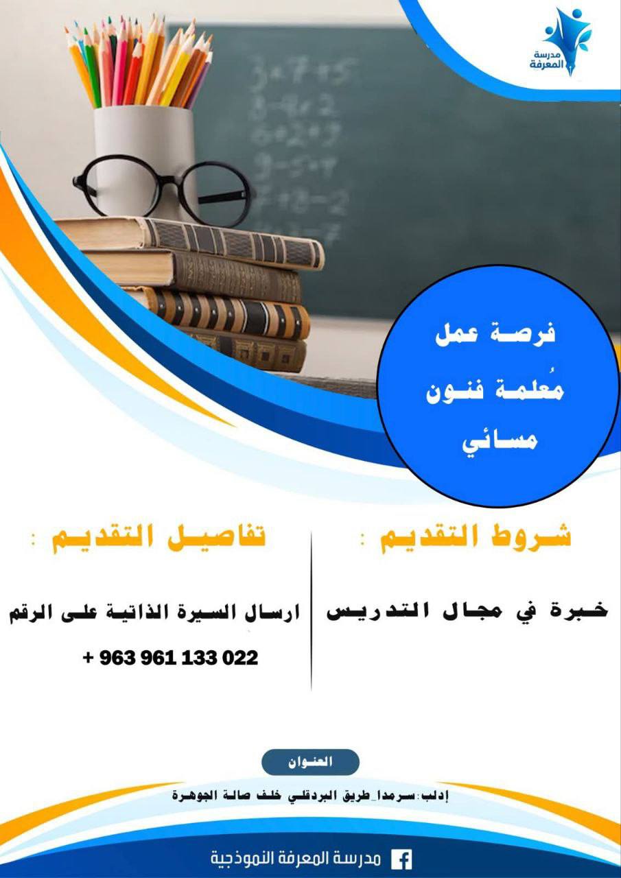 وظيفة معلمة فنون مسائي – مدرسة المعرفة – إدلب 2025