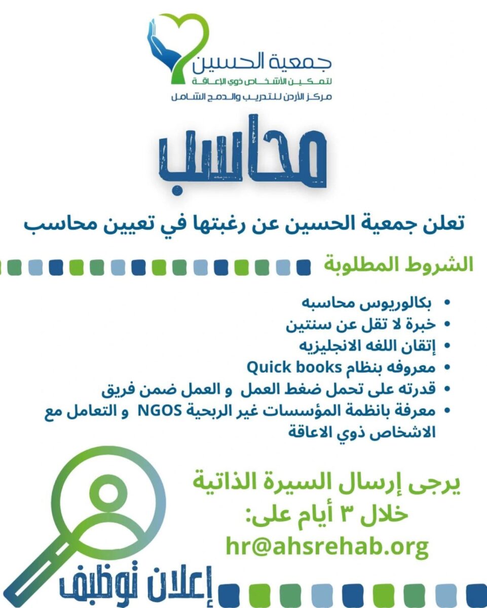 تعلن جمعية الحسين لتمكين الأشخاص ذوي الإعاقة عن حاجتها لتعيين محاسب وفق الشروط التالية: