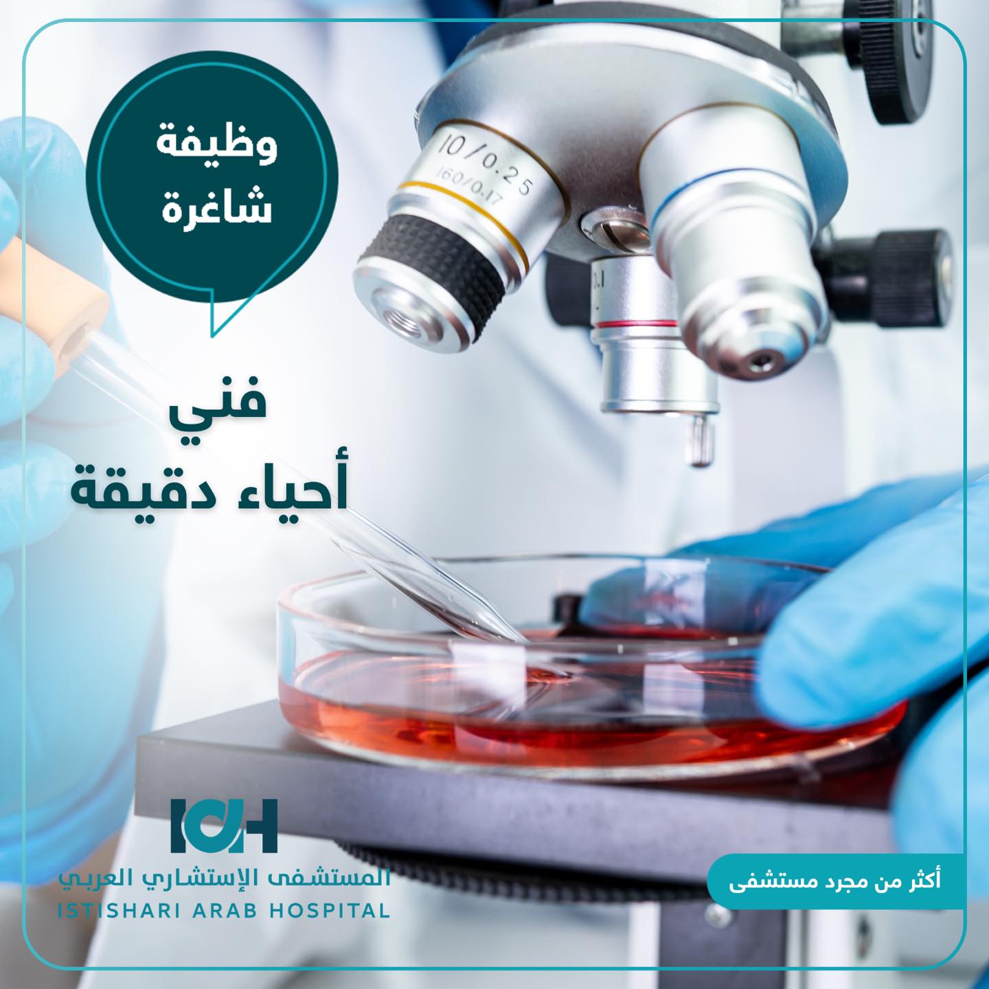 يعلن المستشفى الإستشاري العربي عن حاجته لتعيين فني/ة أحياء دقيقة للعمل ضمن فريق المختبرات، والمساهمة في جميع المهام المساندة بالمختبرات الأخرى مثل الكيمياء السريرية والمناعة، بالإضافة إلى المهام العامة عند الحاجة.