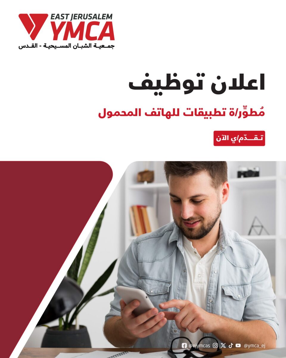 تعلن جمعية الشبان المسيحية EJ-YMCA – بيت لحم عن حاجتها لتعيين مبرمج/ة تطبيقات للهاتف المحمول بعقد محدود المدة، للعمل على تطوير تطبيقات لجميع أنظمة التشغيل (Android و iOS) لدعم كفاءة وشفافية العمليات الداخلية للموظفين والمتطوعين.
