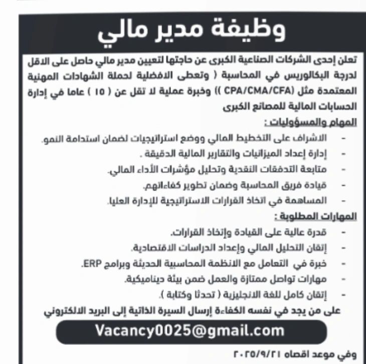 تعلن إحدى الشركات الصناعية الكبرى في الأردن عن حاجتها لتعيين مدير مالي بخبرة واسعة في الإدارة المالية والمحاسبة.