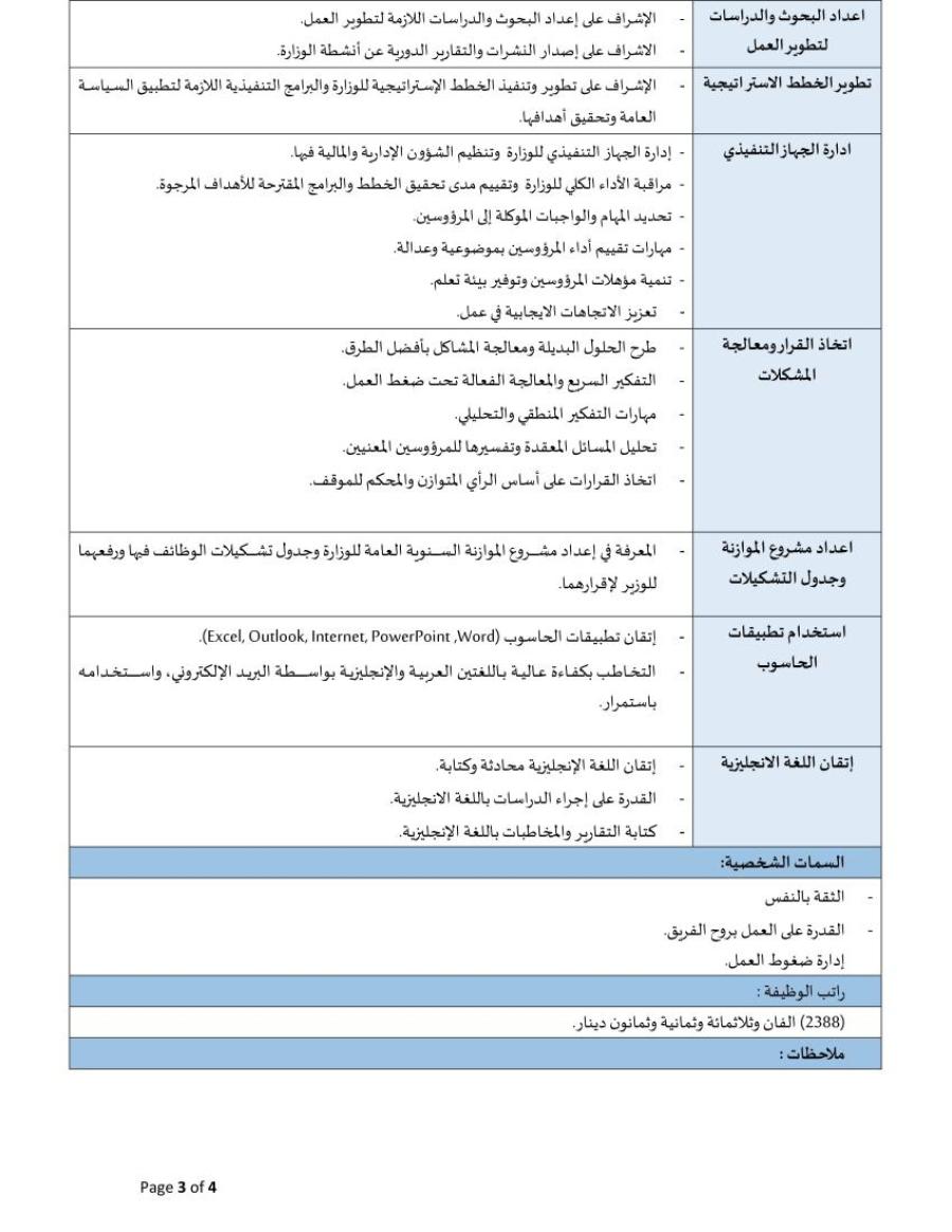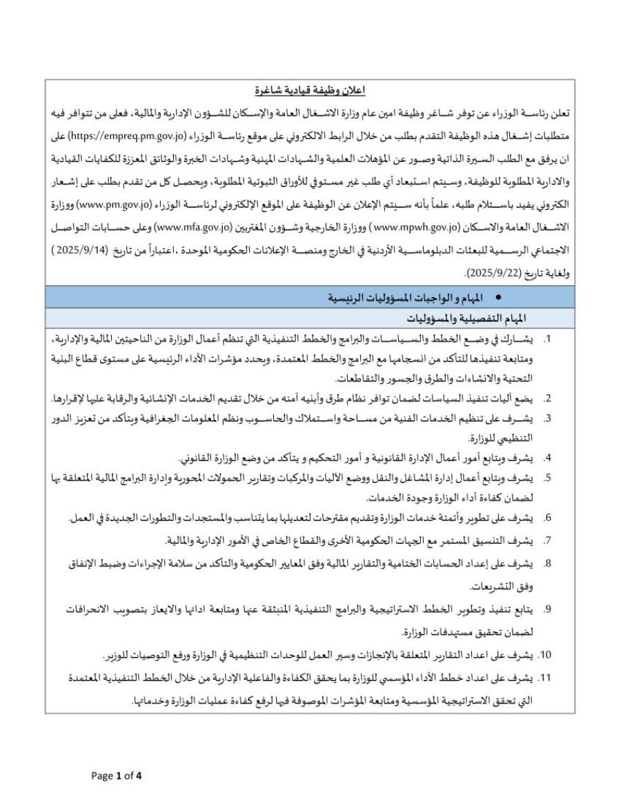 أعلنت رئاسة الوزراء في الأردن عن توفر وظيفة قيادية شاغرة بمسمى: