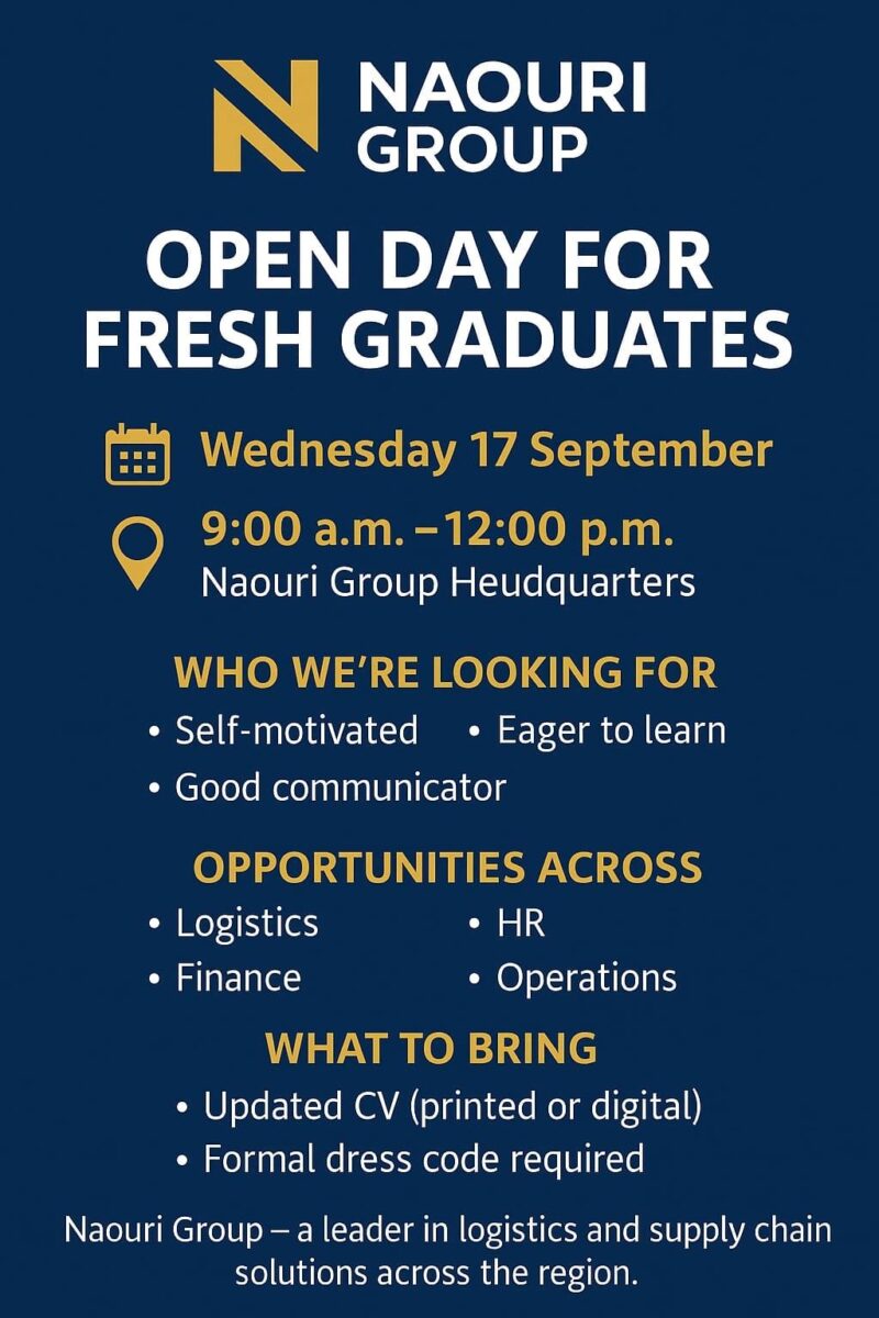 تعلن Naouri Group – الرائدة في خدمات اللوجستيات وسلاسل الإمداد – عن تنظيم يوم مفتوح للخريجين الجدد، لتوفير فرص عمل في مختلف التخصصات: