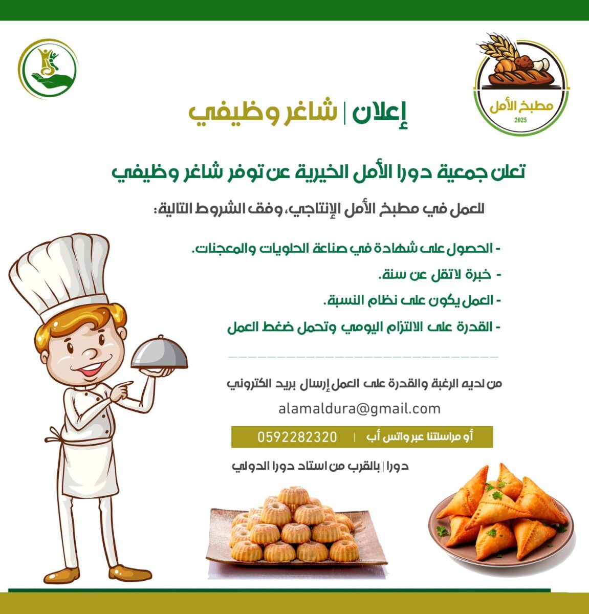 وظائف طباخ – جمعية دورا الأمل الخيرية 2025