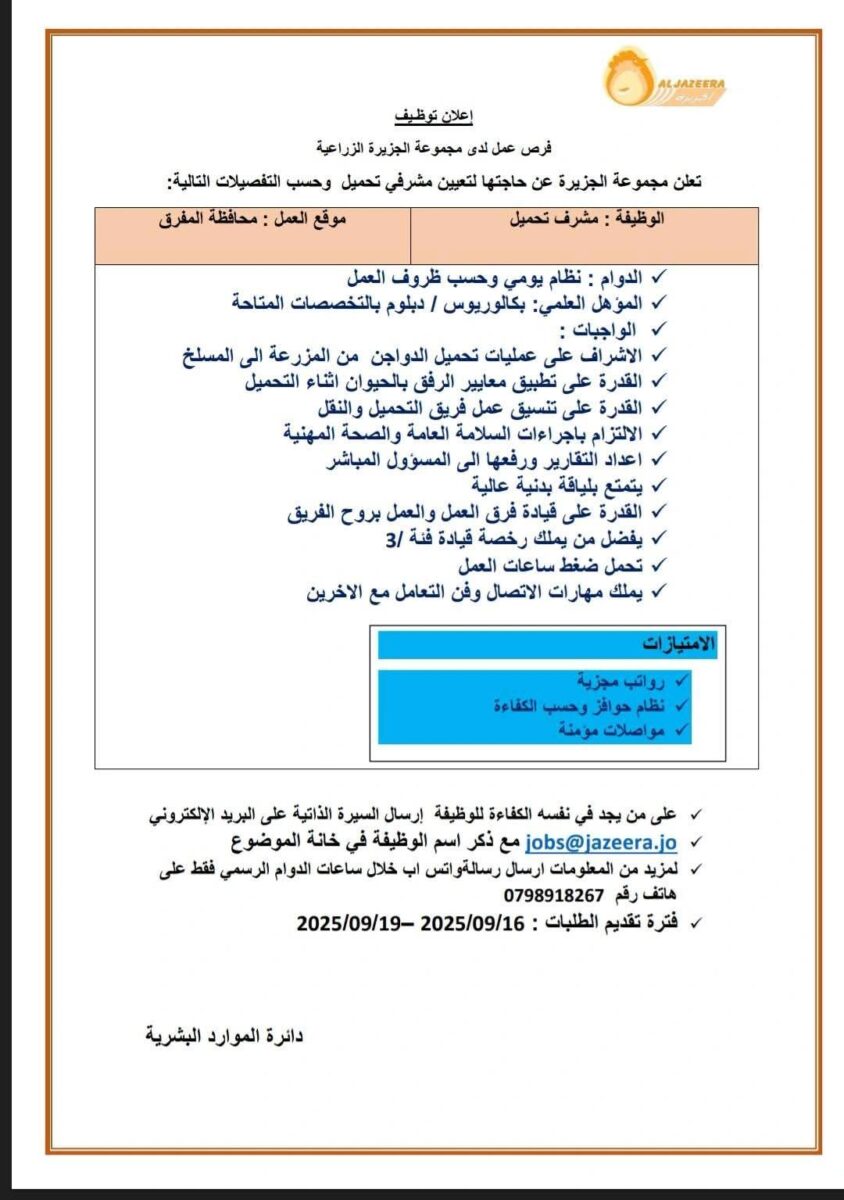 تُعلن مجموعة الجزيرة الزراعية عن حاجتها لتعيين مشرف تحميل للعمل في محافظة المفرق، وذلك حسب التفاصيل التالية: