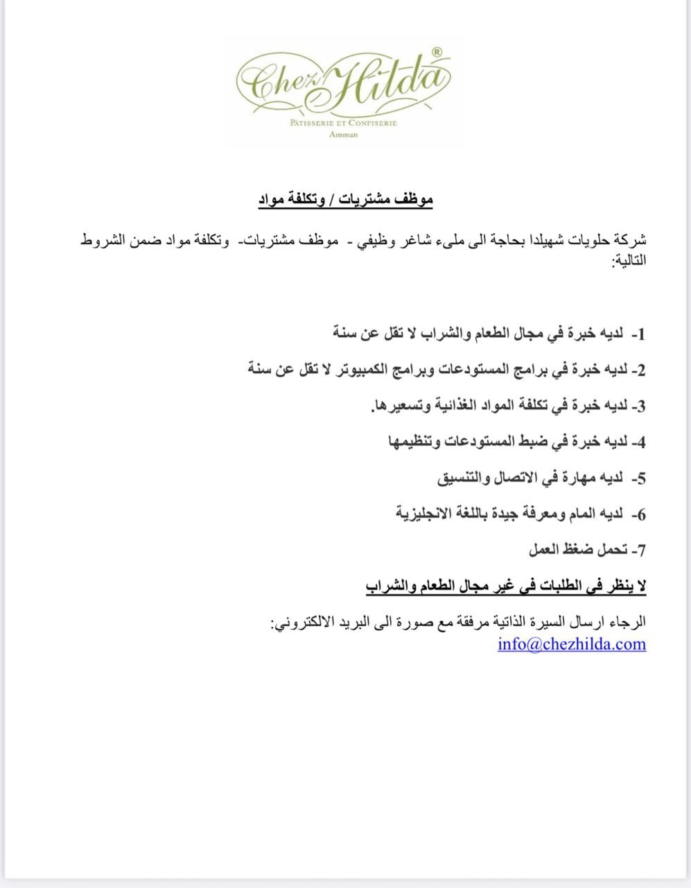 تُعلن شركة حلويات Chez Hilda في عمان عن حاجتها لتعيين موظف مشتريات / تكلفة مواد ضمن الشروط التالية: