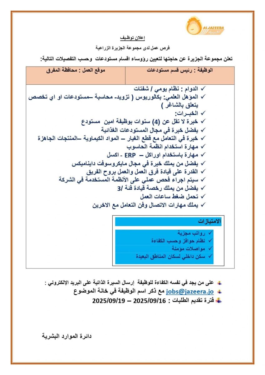 فرصة مميزة: وظائف رئيس قسم مستودعات – مجموعة الجزيرة – المفرق 2025